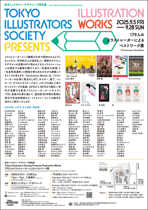 名古屋造形大学ギャラリーでご好評いただいた「Illustration Works」展を東京ミッドタウン・デザインハブにて開催いたします。本展では、東京イラストレーターズ・ソサエティ(TIS)会員の仕事を一堂に集め、ポスター、装丁、パッケージ、デジタルサイネージなど多様なメディアを通じ、イラストレーションの現在地とその表現の広がりをご紹介いたします。(TIS理事長)